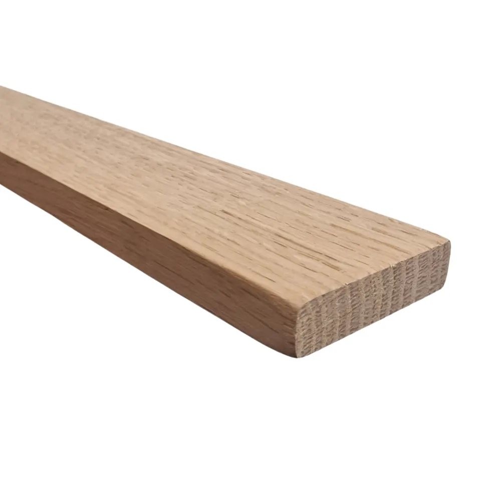 Oak finger joint plank spindle cap for floor to ceiling installations. Covers joints and fixing points to create a clean finish without baserail. Ideal for modern screens.